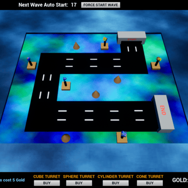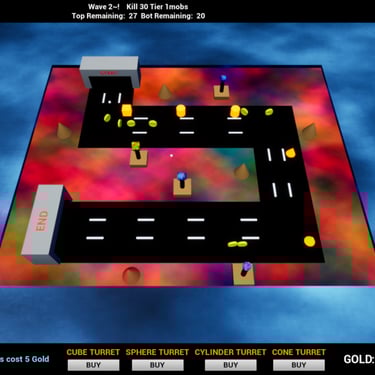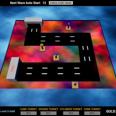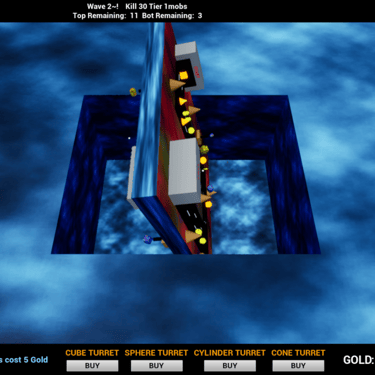 Click buy to place turrets, Press TAB to flip the board, use your mouse to click on turrets to upgrade them and coins to collect the gold. Survive 10 waves to win the game.