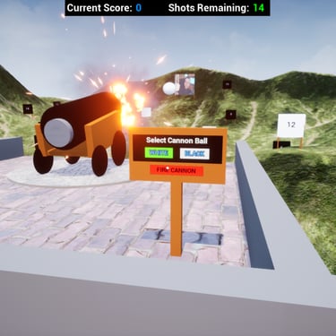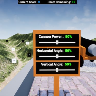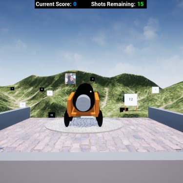 You set the horizontal angle, vertical angle, and power for a cannon to take aim at targets with procedural generated points. You must hit black targets with white balls, and white targets with black balls, or you will lose points. Try to get as many points as you can.